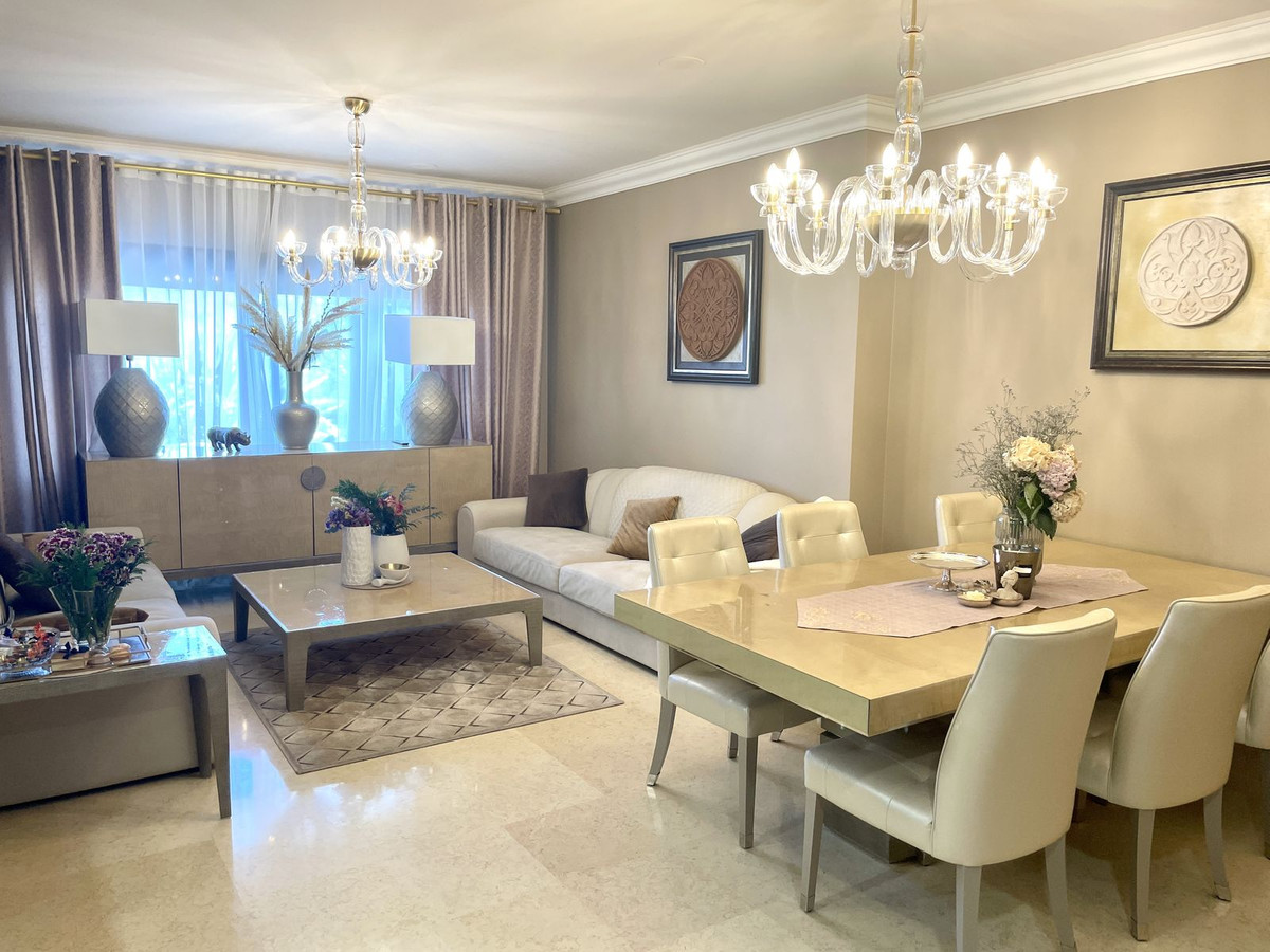 Dit is het enige appartement op de begane grond met vijf slaapkamers, elk met een eigen badkamer, plus een extra gastentoilet. De woning is volledig gerenoveerd met de beste afwerkingen en geluiddemping voor optimaal wooncomfort. Dankzij het geavanceerde luchtzuiveringssysteem geniet je altijd van frisse lucht binnen. De ruime terras op het zuiden/westen biedt een spectaculair uitzicht over de La Higueral Golfbaan, perfect voor mooie zonnestralen overdag en adembenemende zonsondergangen ’s avonds. Het appartement wordt volledig gemeubileerd verkocht, inclusief luxe verlichting van handgeblazen Murano-glas uit Italië. Extra pluspunt: op het terrein vind je maar liefst vijf buitenzwembaden, een verwarmd binnenbad, een moderne fitnessruimte, sauna, stoombad en spa. Daarnaast is de ruimte flexibel en kan eenvoudig worden opgesplitst in twee aparte appartementen.