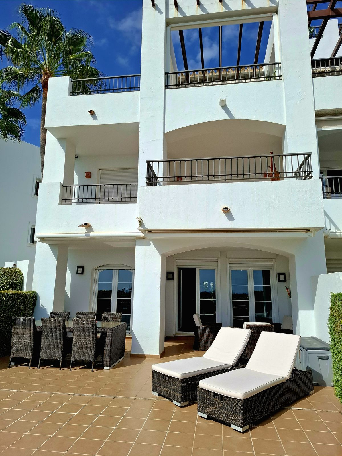 Dit uitstekende eerstelijns golfappartement ligt in een fraaie urbanisatie nabij bos en golfbaan, met zuidoriëntatie voor optimale zon. De woning is volledig gemeubileerd en beschikt over twee slaapkamers, waaronder een master met ensuite badkamer en toegang tot een privé terras. Geniet van een groot overdekt terras met uitzicht op de zee, golfbaan, zwembad en fraai onderhouden gemeenschappelijke tuinen.