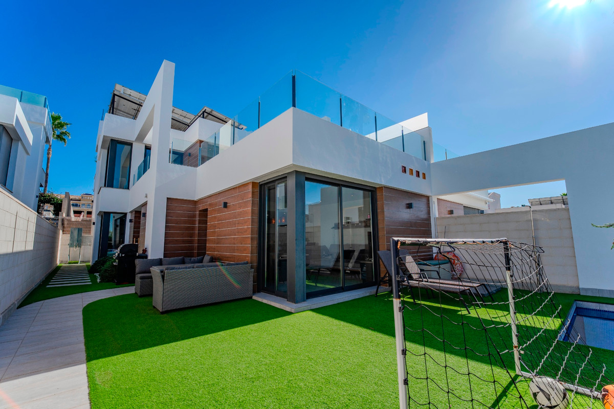 Deze moderne villa beschikt over een open woon- en eetruimte met een hoogglans designkeuken en geïntegreerde apparatuur, perfect voor gezellig samen zijn. Met drie slaapkamers, waaronder een master suite met inloopkast, ensuite badkamer en toegang tot het solarium, is er veel comfort en privacy. De vloerverwarming in alle badkamers zorgt voor extra luxe, terwijl de zonnebank een fijne extra is om te ontspannen. Buiten vind je een privézwembad, een buitendouche en een onderhoudsvriendelijke tuin. Voor comfort en energiezuinigheid zijn er zonnepanelen met batterijopslag en een airconditioning met kanalen op de begane grond plus een extra unit boven. Parkeren op eigen terrein achter een elektrische poort maakt het geheel compleet.