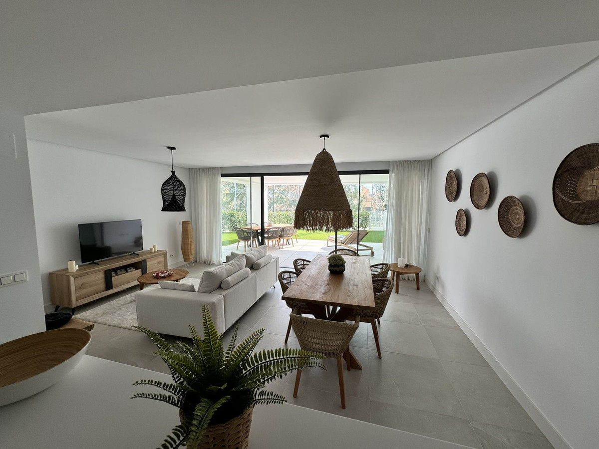 Dit fantastische appartement heeft een royale leefruimte met een groot terras van 35 m² en een privétuin van 35 m². Het is gelegen op de verhoogde begane grond en is toegankelijk via een lift. De keuken is volledig uitgerust met hoogwaardige NEFF-apparatuur, inclusief wasmachine en droger. Met warm/koud airconditioning via aerothermie en vloerverwarming in de badkamers ervaar je optimaal comfort en energiebesparing. Het slimme huis-systeem maakt het mogelijk om verlichting, elektrische rolluiken en temperatuur eenvoudig via een app te bedienen. Er zijn twee parkeerplaatsen inbegrepen: een ondergronds en een gezamenlijke, plus een grote berging. De beveiligde urbanisatie heeft 12 uur per dag beveiligingspersoneel en biedt onder andere een verwarmd binnenzwembad, een buitenzwembad en een moderne fitnessruimte. Op loopafstand van de beroemde duinen, het strand en de jachthaven van Cabopino, en slechts 15 minuten rijden van het centrum van Marbella.