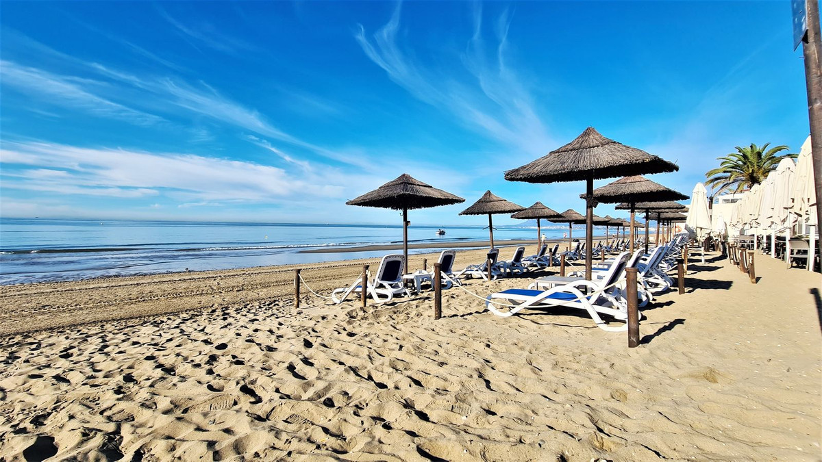 Fantastisch, zonnig appartement op de begane grond met een grote omringende terrace, gelegen in een geliefd wooncomplex direct aan het strand in Marbella. Geniet van het aangename klimaat en uitzicht op tropische tuinen, perfect voor gezinnen die comfort en rust zoeken dichtbij alle voorzieningen.