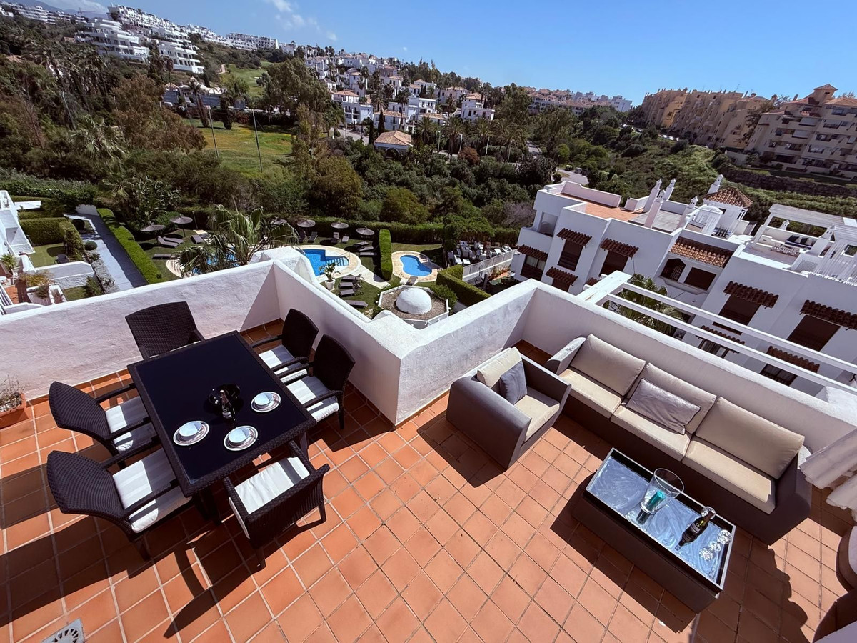 Deze penthouse is perfect instapklaar! Volledig gemeubileerd met een moderne, stijlvolle inrichting – neem enkel je koffer mee en geniet van het leven! De lichte, ruime open woonkamer en eetkamer stromen naadloos door naar twee enorme terrassen, perfect voor een ochtendkoffie of een cocktail bij zonsondergang. De master bedroom heeft toegang tot een privéterras met adembenemend uitzicht over de golfbaan. De zon schijnt de hele dag op de wraparound terrassen die het gouden licht van de Costa del Sol opvangen. De duplex, verdeeld over twee niveaus, biedt drie ruime slaapkamers en twee moderne badkamers, met elegante, moderne interieurs die klaar zijn om jouw thuis te worden.