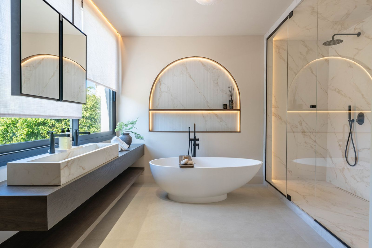 Ontdek deze recent gerenoveerde villa met Scandinavisch-Japandi interieur in het hart van Nueva Andalucía. Vijf slaapkamers, zes badkamers, een ruime tuin met zwembad, jacuzzi en een buiten fitnessruimte maken dit huis een perfecte mix van luxe, privacy en modern comfort.