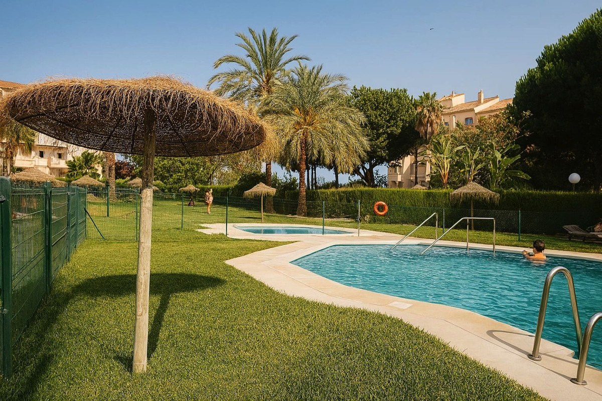 Volledig gerenoveerd en gemeubileerd appartement van 122 m² in Sun Park, Estepona. Geniet van een zonnig terras op het zuiden met uitzicht op zee en twee gemeenschappelijke zwembaden. Perfect gelegen in een veilige urbanisatie nabij het strand, winkels en het centrum van Estepona.